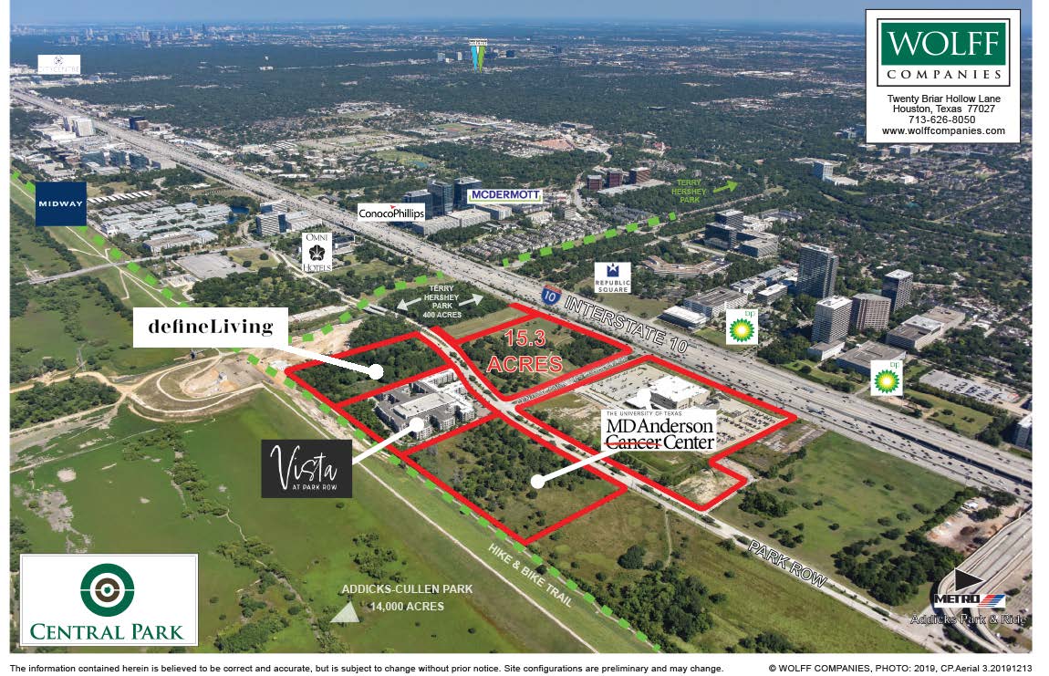 The largest remaining parcel of land available for development in The Energy Corridor, Wolff Companies’ Central Park is a master-planned environment located on the north side of Interstate 10 between North Eldridge Parkway and State Highway 6. With excellent visibility and access from I-10, Central Park is already home to premier institutions, such as MD Anderson Cancer Center. Bordered by permanent greenspace on two sides, Central Park offers a matchless environment in the economic heart of Houston.